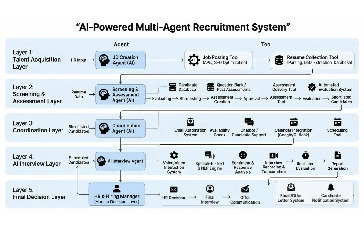 It is about designing intelligent systems where AI and humans collaborate effectively. By structuring recruitment into layered AI agents supported by tools and data pipelines, organizations can: